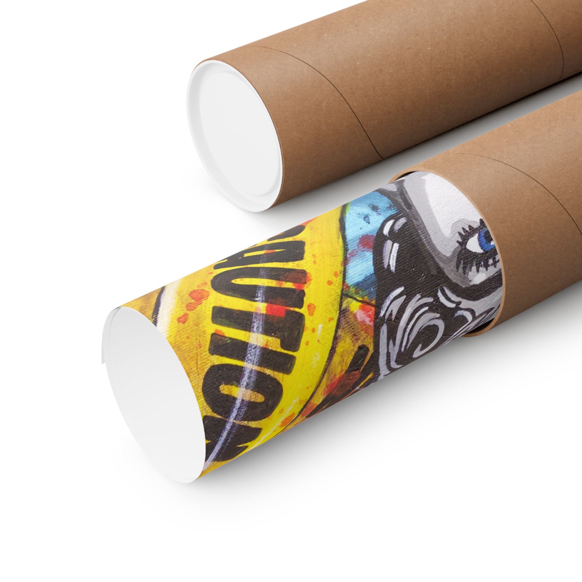 This matte horizontal poster puts bold street-art energy on archival museum-grade paper. A stylized portrait — soft grayscale tones for the face, electric blue eyes, and splashes of red — is framed by diagonal yellow “CAUTION” tape that cuts across a textured cyan background. The matte finish soaks up light for a painterly, gallery-style look while the giclée printing preserves intense color and fine detail without fading. Hung over a mantel, leaned against a shelf, or used to anchor a gallery wall, this poster brings edgy, conversation-starting attitude to indoor spaces that celebrate pop culture, urban art, and retro-modern style.
