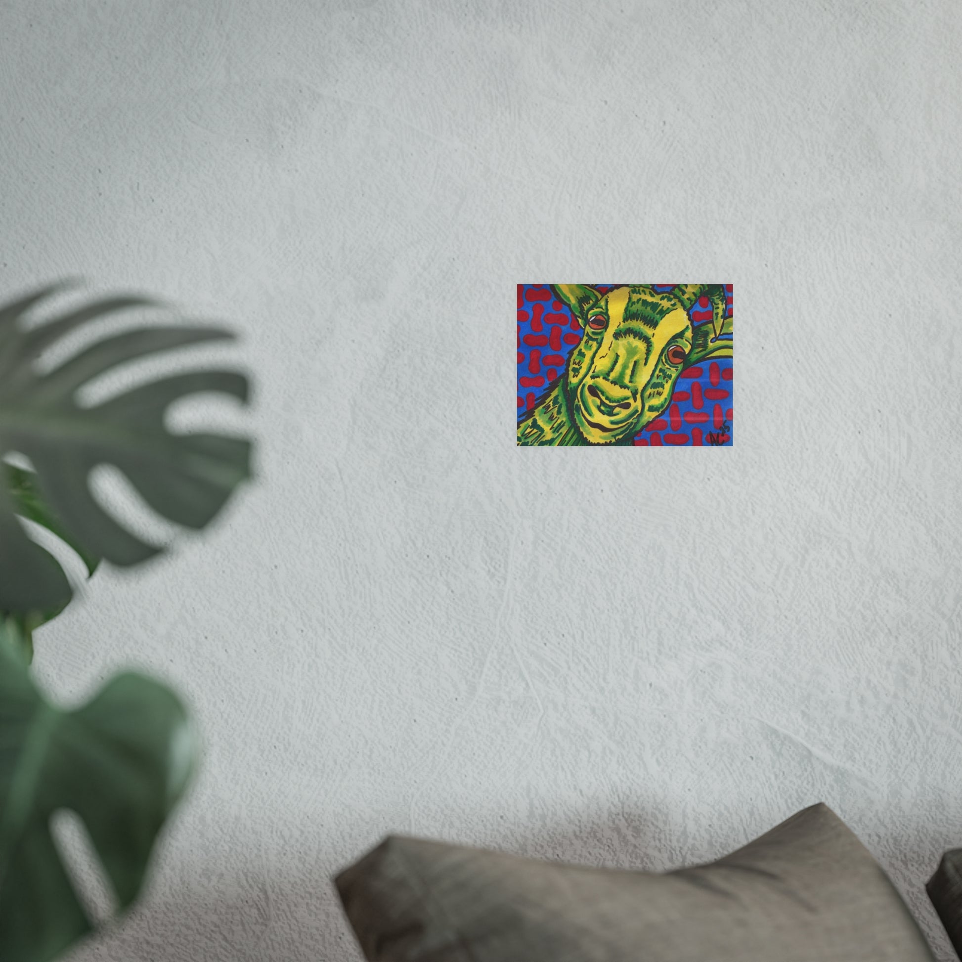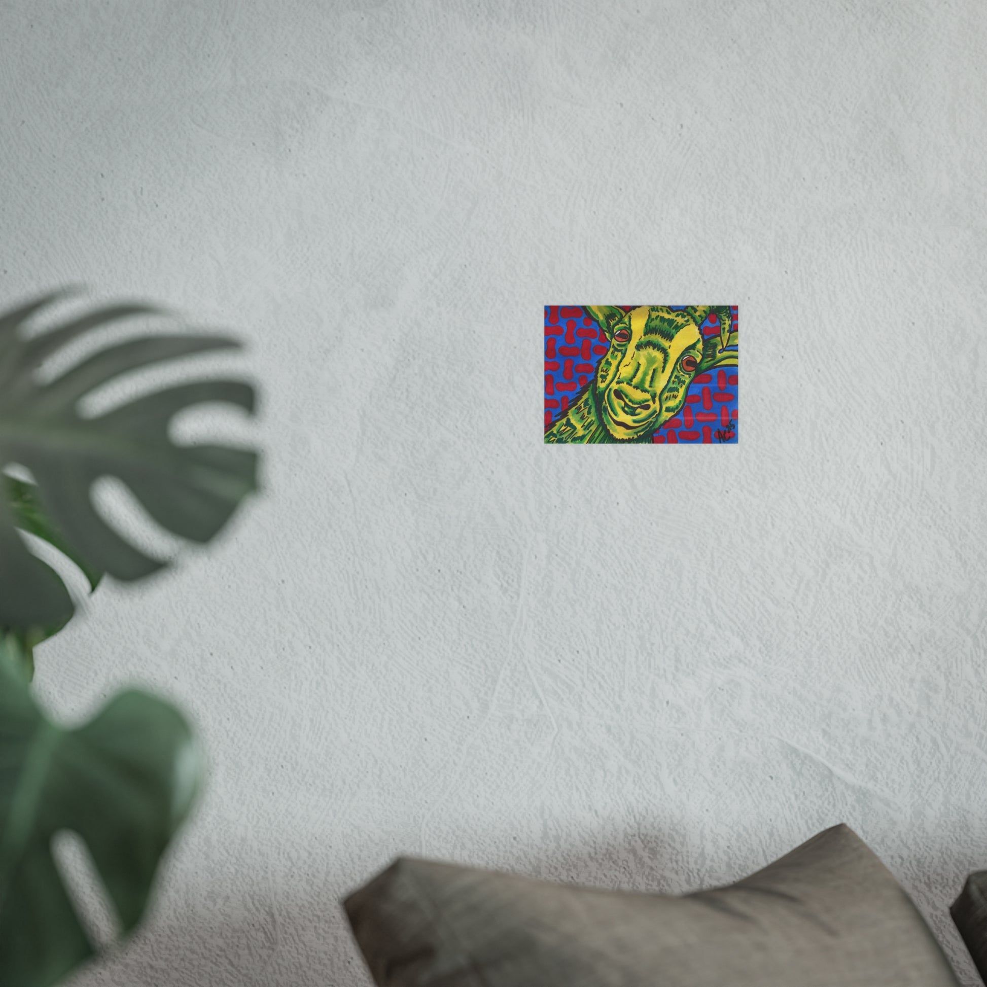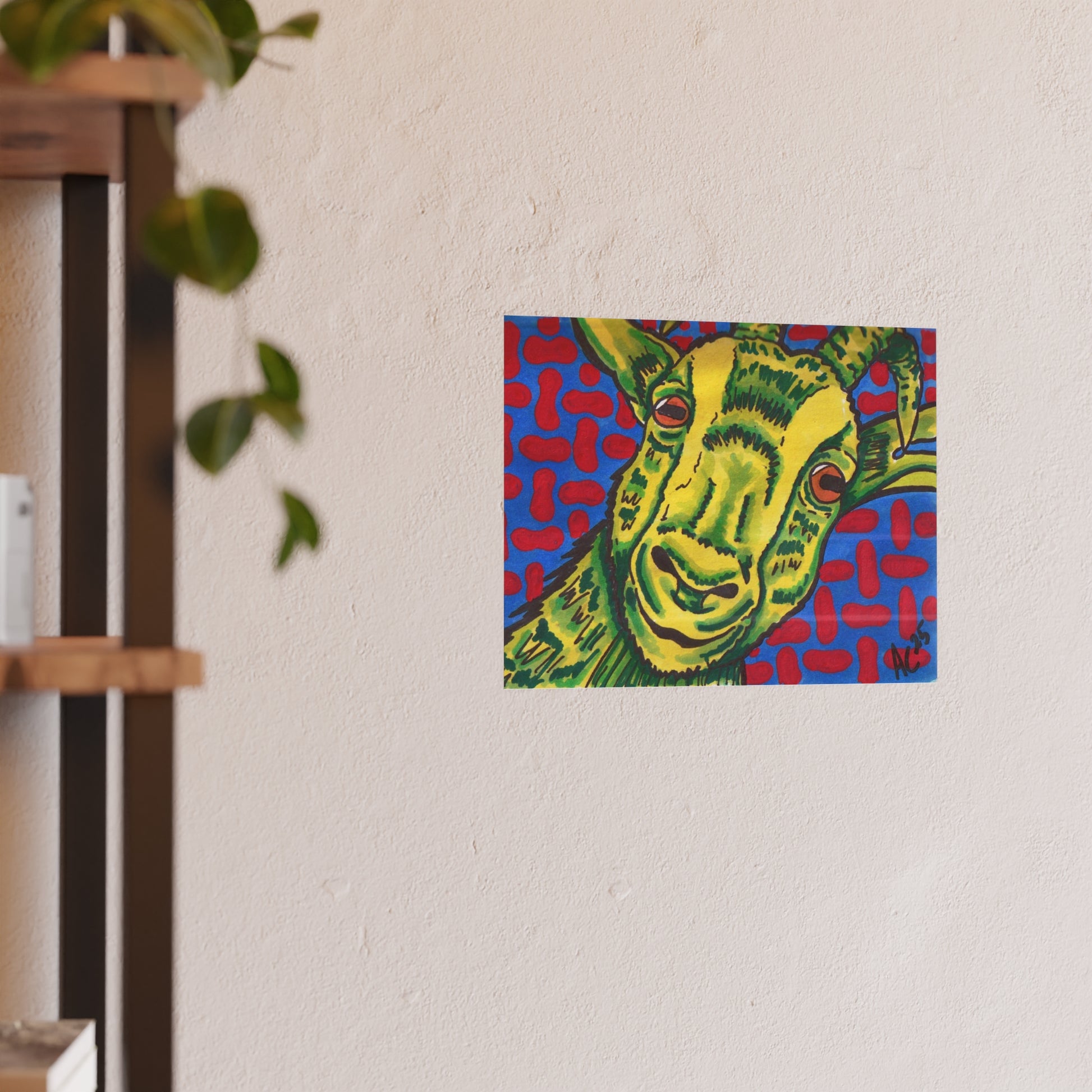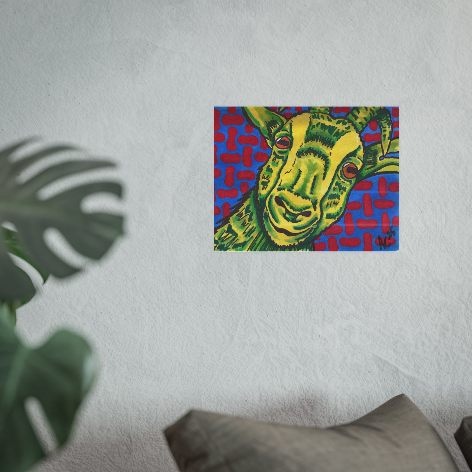 A lime-green goat with a stare that’s half wisdom, half mischief, caught mid-thought in a bubble-pocked dimension of barnyard absurdity. With eyes wide and a grin that knows too much, this piece chews through convention and spits out pop-art chaos. It’s livestock with a license to philosophize—and maybe start trouble.